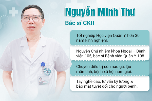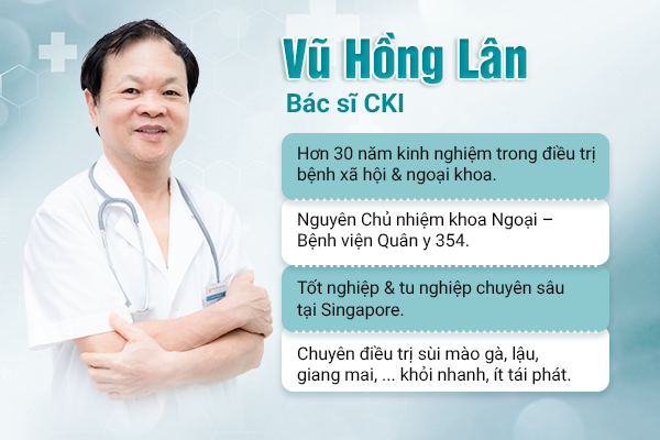 Bác sĩ CKI Vũ Hồng Lân: Gần 40 năm kinh nghiệm tại Bệnh viện Quân Y 354, được đào tạo chuyên sâu quốc tế. Bác sĩ chuyên điều trị sùi mào gà vùng kín và hậu môn cho cả nam và nữ bằng kỹ thuật hiện đại.
