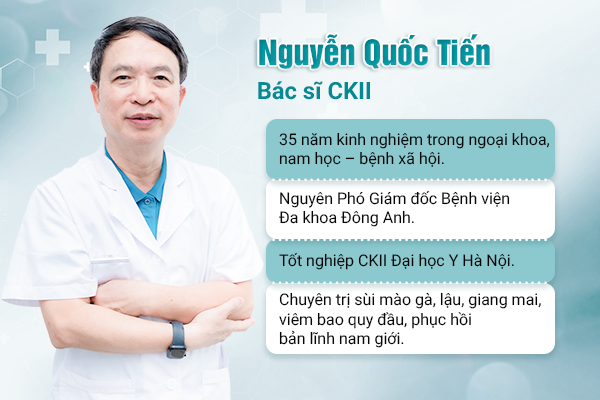 Bác sĩ CKII Nguyễn Quốc Tiến: Nguyên Phó Giám đốc Bệnh viện Đông Anh, là chuyên gia hàng đầu về bệnh xã hội nam giới. Bác sĩ xử lý hiệu quả các trường hợp sùi mào gà phức tạp vùng dương vật, bìu và hậu môn.