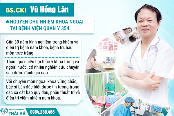 BS.CKI Vũ Hồng Lân nguyên Chủ nhiệm khoa Ngoại BV Quân Y 354, chuyên bệnh trĩ và nam khoa.
