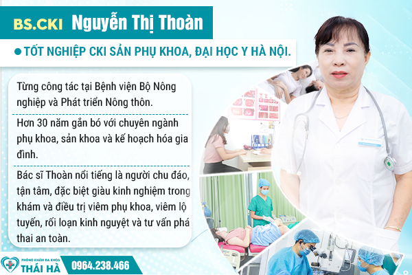 - BS.CKI Nguyễn Thị Thoàn: Hơn 35 năm kinh nghiệm, chuyên điều trị viêm âm đạo, viêm cổ tử cung, viêm lộ tuyến cổ tử cung. Bác sĩ được hàng nghìn bệnh nhân tin tưởng nhờ sự tận tâm và tỉ mỉ trong từng ca điều trị.